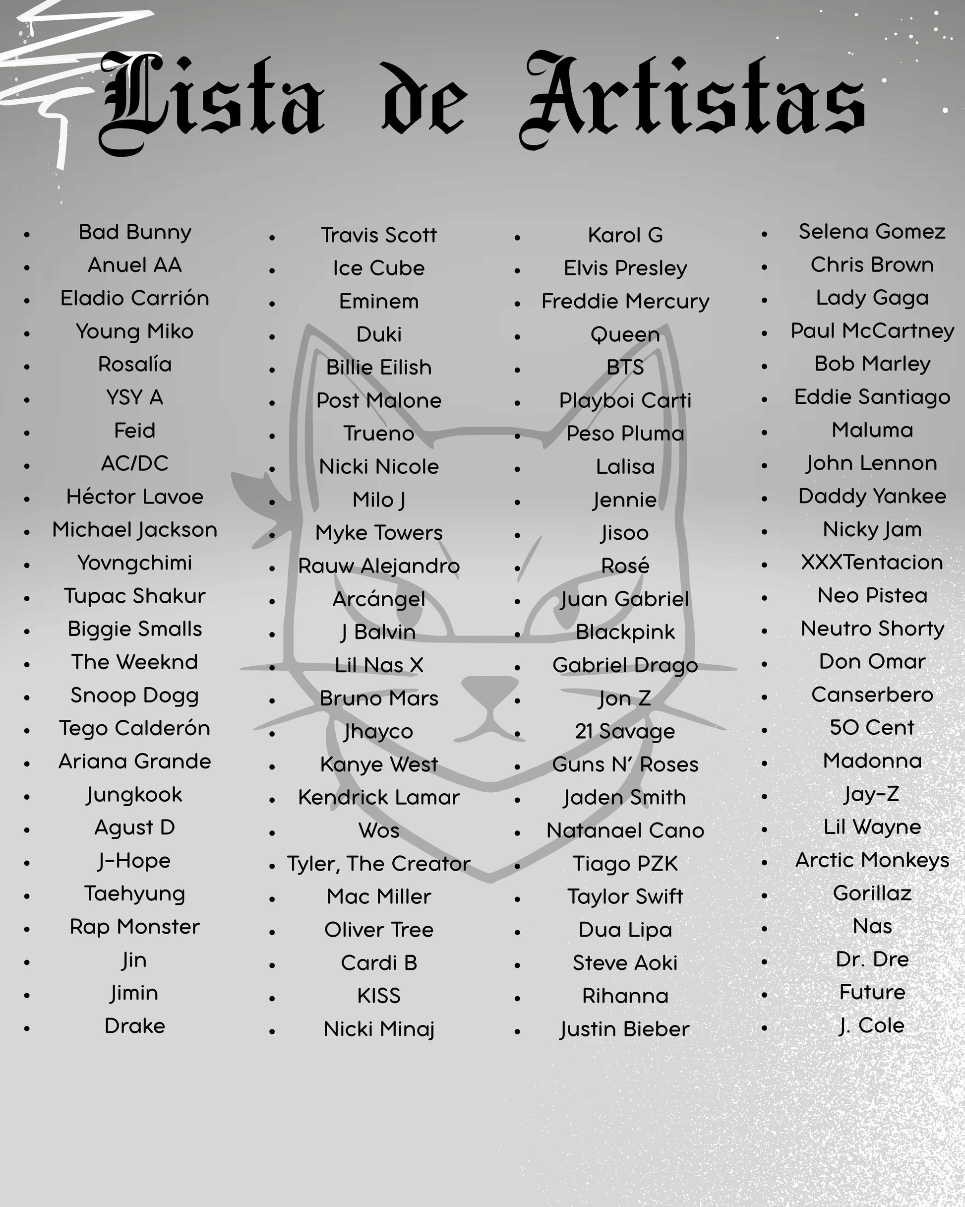✔️ Incluye 100 artistas diferentes (Bad Bunny, Tupac, Travis Scott, The Weeknd, Young Miko, Peso Pluma, Eminem, Michael Jackson y más).